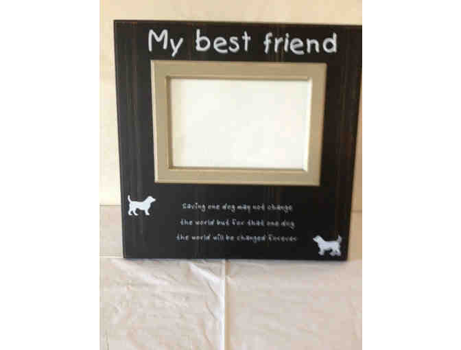 My Best Friend wooden frame, with saying: "saving one dog may not change the world but for that one dog the world will be changed forever." Total frame size is 10" X 10". Holds a $" X 6" photograph.