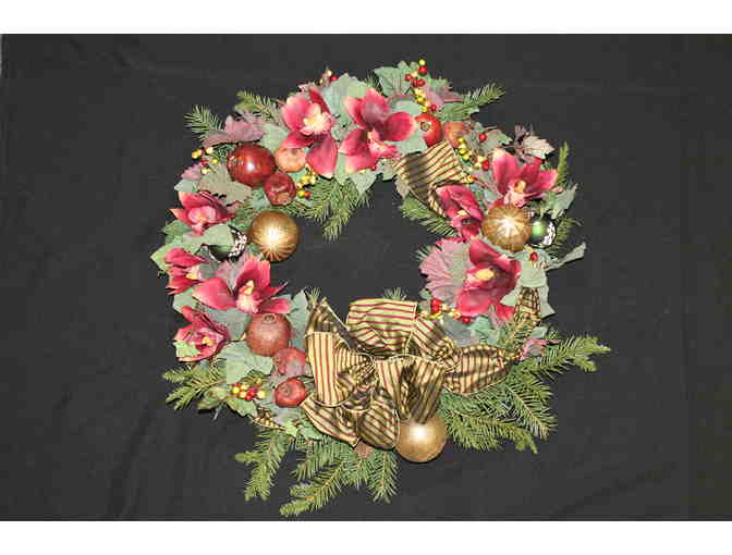 Cumbidium Orchids, pomegranates, gold ornaments, Christmas greens and berries with a green and red strip bow.