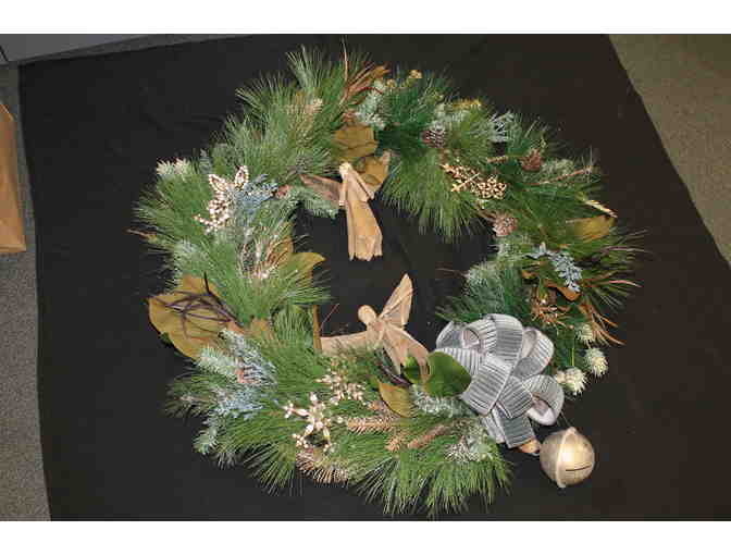 Wreath includes handmade wooden angel, weathered brass bells, designer trim from Samuel & Sons and a mix of natural elements. Handmade copper and crystal ornaments finish it off with a sparkle.