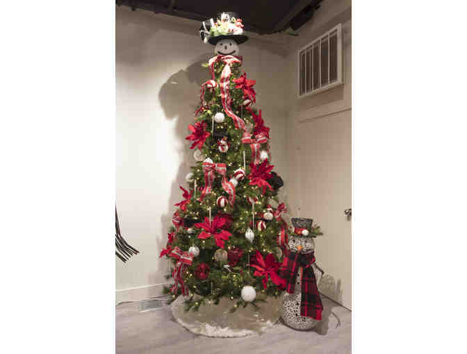 Our beautiful snow man themed tree will transport you to a sparkling winter wonderland bringing warmth and good cheer. The snowmen adorning the tree intermingle with fluffy glittering snowballs, flowing red garlands with swirling peppermint ornaments. As the song goes, “There must be some magic in that old silk hat they found,” which inspired the crowning top hat.  This tree embodies the warm memories associated with a winter wonderland experience.