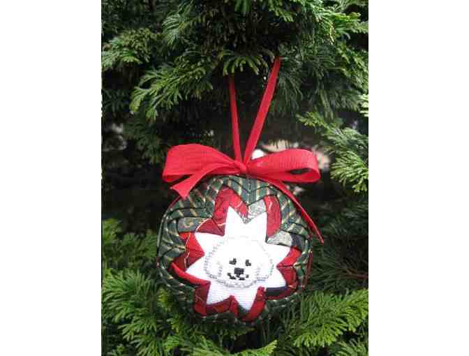 3" diameter ornament with 1" cross stitched Bichon head. One of a kind custom made ornament by donor.