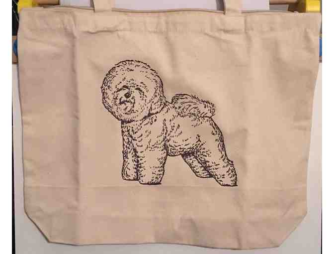 Lovely tote bag with vintage Bichon illustration. Cotton twill with straps, and flat bottom. The image is professionally heat transferred to the bag, and will wear well wash after wash. Measures 17 " Wide X 14 " High