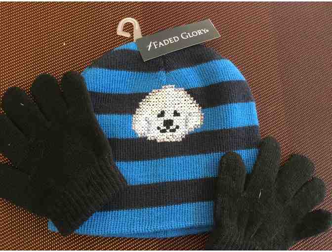 From a past holiday acution, but all the grandbabies are girls! Baby one sized black and blue striped hate with an embroidered bichon on it with small black gloves...adorable for your son or grandson