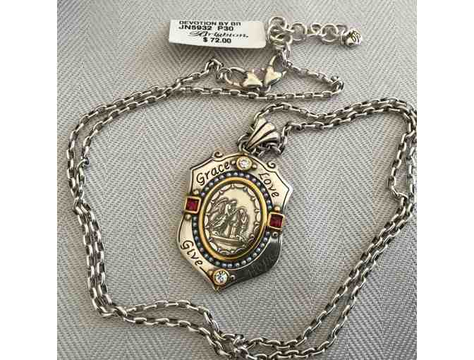 Beautiful angel blessing a person kneeling down with silver and gold tones with clear/red sparkles and simulated baby pears circling the center with Give Grace, Love, Hope. Bach has "Take time to Listen" with scrolls and a sparkle. Chain is 32". Beautiful as a religious gift or for yourself to shine in the angels gift of grace....