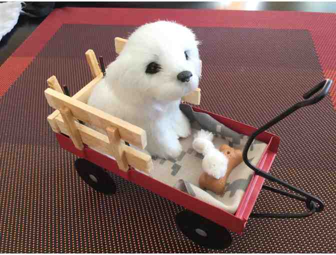 Bichon in a little red wagon with treats