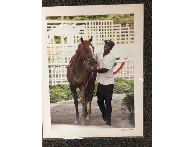 Photograph of Eclipse Award winning 1990 Champion 2 Year Old Filly Meadow Star being led from the paddock. Signed by photographer Joel Silva. Unframed dimensions 11x14"
