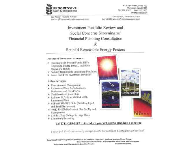 Investment portfolio review and social concerns screening with financial planning consultation, plus set of 4 renewable energy posters.