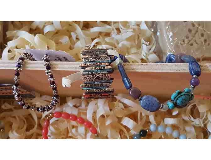 This unique birch treasure box is full of treasures for the ladies, you scalliwag! Three Pure Life jade bracelets, a set of Cheri Vissichelli turquoise earrings, a Be You Local pendant necklace, a southwest designs purple faceted crystal bracelet, T&G hand crafted soaps, a Happy/Fantastic/Lovely bracelet, a stone and turquoise bracelet, and BT Beads Bear Fetish earrings. Avast!