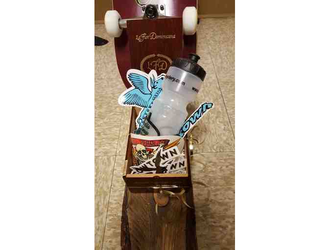 Get out and shred on this awesome Cowtown custom skateboard. Includes water Landis Cyclery water bottle and plenty of stickers, all in a cool rustic box