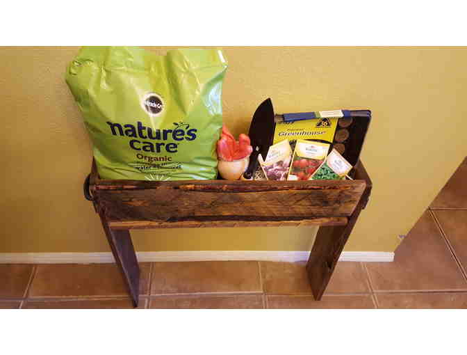 Rustic reclaimed wood planter filled with organic soil, a seed starter kit, trowel, mini pot, and gloves