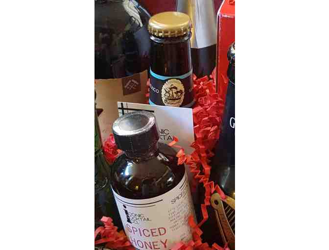 4 wine glasses, Barefoot Bubbly Champagne, 7 Deadly Zin Wine, Lucky Buddha, Ensenada Brewing, New Castle Brown Ale, and Guinness Beer. Iconic Cocktail Mixers, and Reclaimed Rustic bottle opener