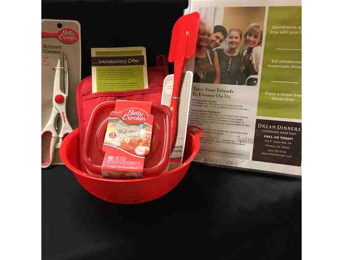 Certificate to Dream Dinners. Introductory Offer allows you to customize easy homemade meals -- up to six family dinners (18-servings). Basket includes colander, pot holder, spatula, scissors and storage containers.