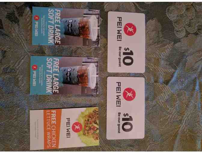 Pei Wei gift cards including: (2) $10 gift cards; two (2) large drinks; and (1) chicken lettuce wrap.