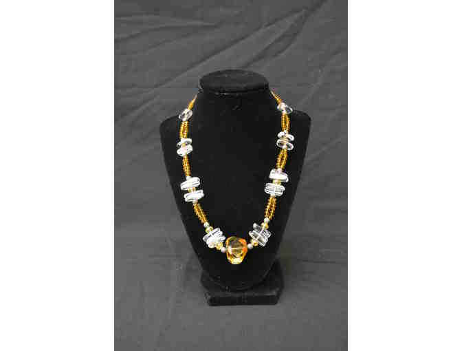 A double-strand amber glass and crystal necklace - measure approximately 18.5" long. This unique necklace will be a conversation starter!