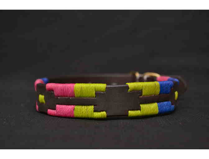 A royal blue, pink, and lime green Moreno Polo dog collar in size XXS from Shires Equestrian. Handmade in Argentina with high quality leather. The collar is approximately 3/4" wide and 14.75" long.