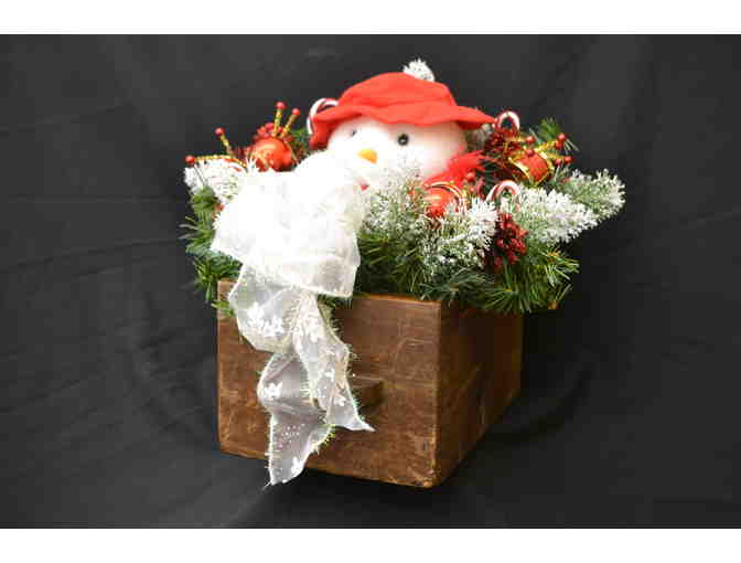A large holiday centerpiece featuring a tan bear inside of a wooden box; Designed by Beverly Dantos.