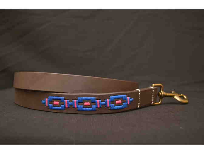 A royal blue and pink Criollo Polo dog leash in size large from Shires Equestrian. Handmade in Argentina with high quality leather.