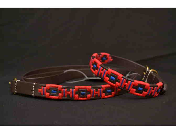 A red and blue Criollo Polo dog collar and leash set in size small from Shires Equestrian. Handmade in Argentina with high quality leather.