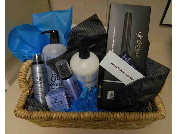 Gift basket from Blue Hair Studio in Marshfield, Wisconsin includes: ghd classic professional 1" flatiron and a large selection of full-size Bumble & Bumble hair products.