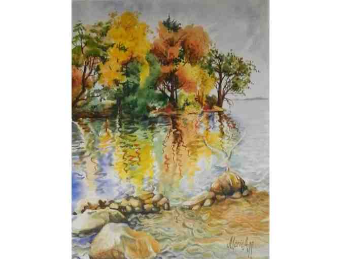 Marie App Art Studio: "Reflections" framed original watercolor featuring autumn trees and water 21x17"