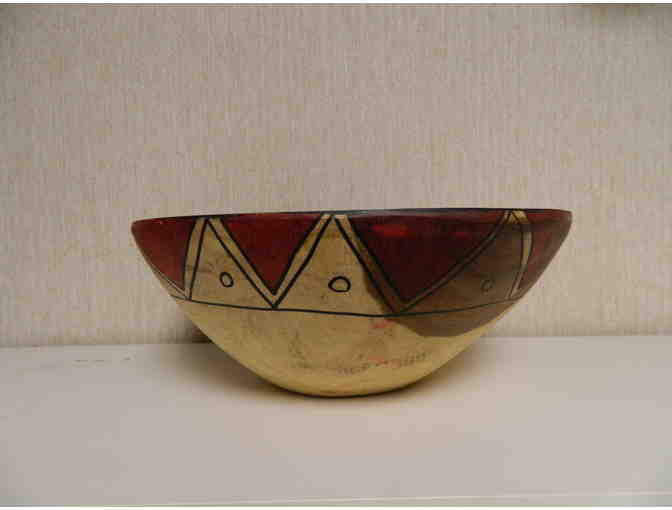 Beautiful hand crafted 11" wood bowl, meticulously stained in a colorful South African motif. Created by craftspeople in Africa.