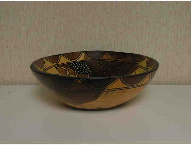 Beautiful hand crafted 10" shallow wood bowl, meticulously stained in South African motif. Created by craftspeople in Africa.