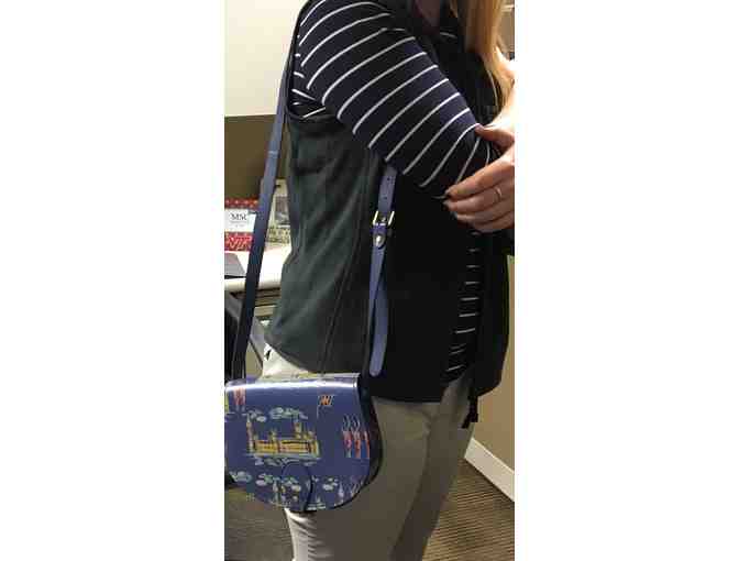 Whimsical blue crossbody purse from Johnnie B by Boden. Printed with British landmarks.