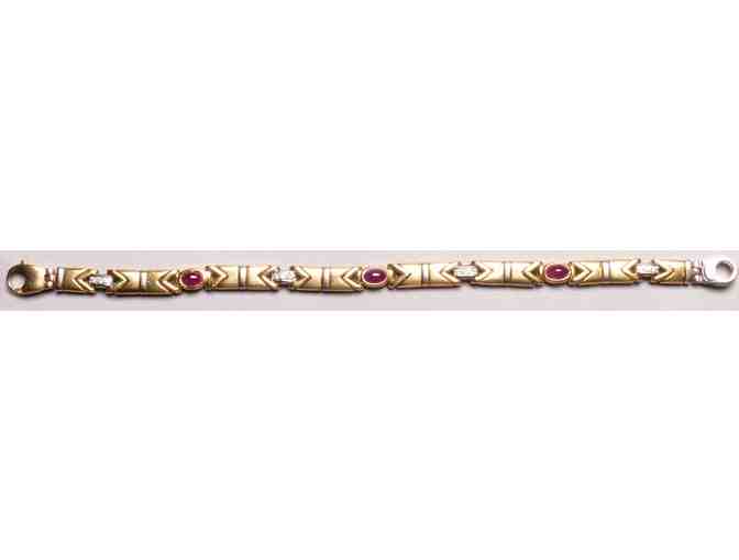 Details: Firestone & Parson 18 Karat yellow and white gold cabochon ruby and round diamond geometric link bracelet, 7 ½ inches