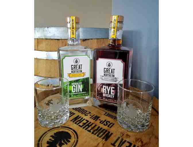 A selection of Great Northern Distillery Herbalist Gin and Rye Whiskey as well as two Great Northern Distillery logo etched glasses will go to the lucky winner of this item!