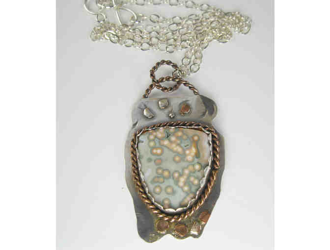 Necklace featruing fabricted sterling and copper which highlights an ocean jasper stone on a sterling chain. By national award-winning artist Joan North.