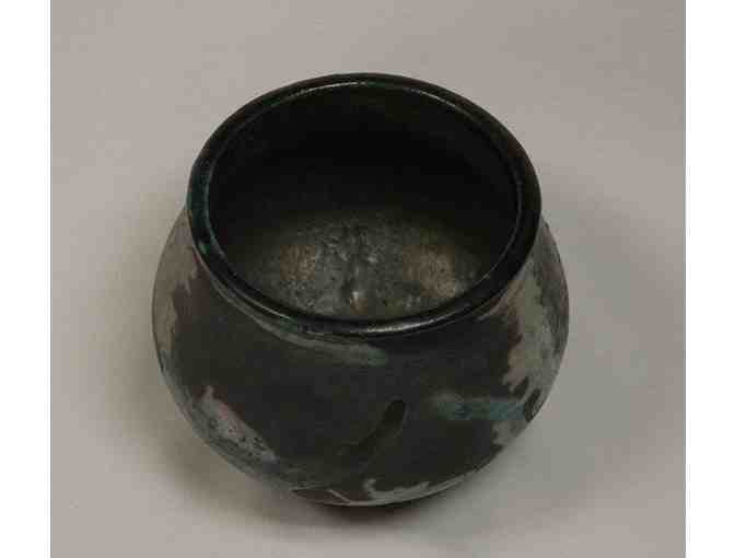 Raku fired porcelain vessel with copper. By local artist Kathleen Rulka - Egnacé Ceramic and Glass Studio. This stunner is @6" in height.