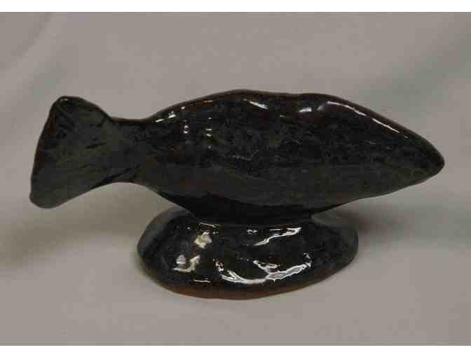 High fire stoneware sculpture of a fish by local artist Kathleen Rulka - Egnacé Ceramic and Glass Studio. Stands @6" high and is @8" in length.