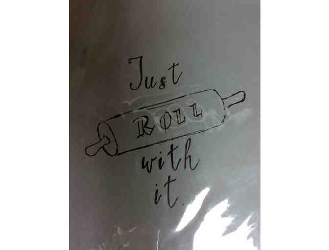 This cheeky unframed screen print from Tangled up in Hue hopes you will "Just Roll with It". This would make a great addition to any kitchen!