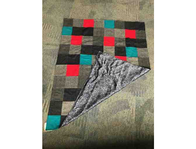 Bid to win a hand made, patch-work quilt featuring different patterns of grays, black, blue and red wool squares and backed with a neutral satin material!