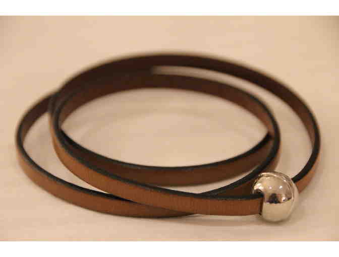 This tan-toned leather bracelet, made by an artisan in Madrid, Spain is suitable for a man or a woman. Features a magnetic ball closure.
