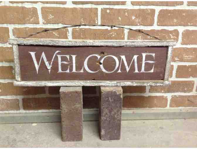One-of-a-kind, professionally hand-lettered, recovered barn wood "Welcome" sign made by Dave Correll and Ann Meillier of Brushwork Signs in Faribault. Measures 6" high x 21" wide with barbed wire hanger.