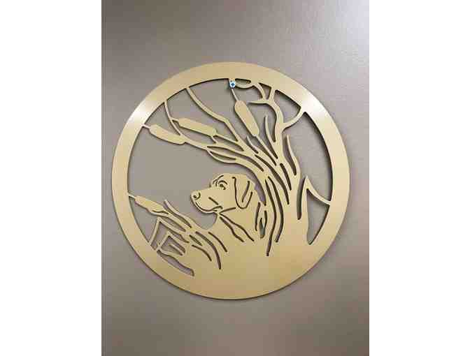 Precision laser cut out of 16 gauge steel, this image of a lab in cattails is painted in an attractive light tan color. Measures 13" in diameter. Both sides are finished so can be reversed.