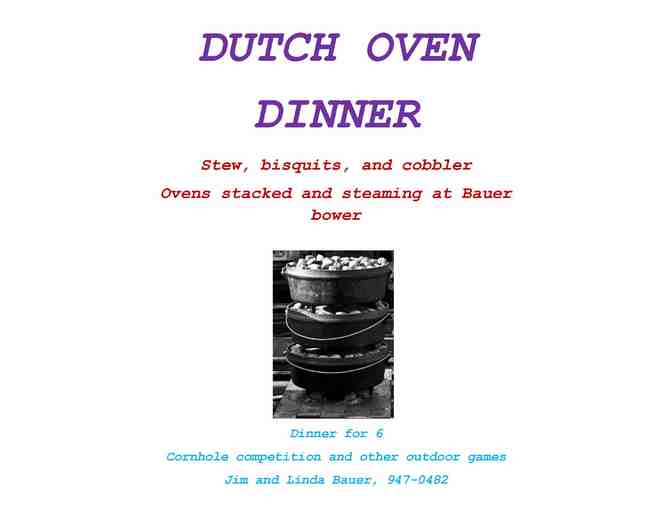 DUTCH OVEN DINNER Stew, bisquits, salad, and cobbler. Ovens stacked and steaming at the Bauer Bower! Dinner and drinks for six. Cornhole competition and other outdoor games.