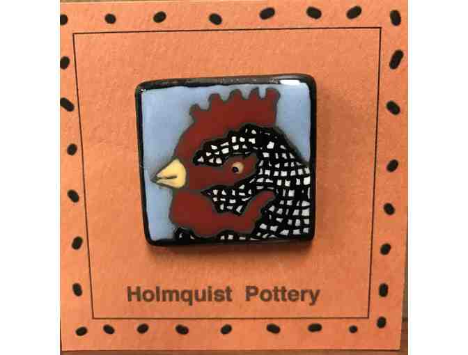 Handmade and handpainted ceramic pin with whimsical animal face. Measures approximately 1.25" square. Made by Chris and Sue Holmquist, a husband/wife pottery team from Northfield. They make and decorate earthenware platters, plates, pots, mugs and pins. Childrens' books are the inspiration for the whimsical animals.