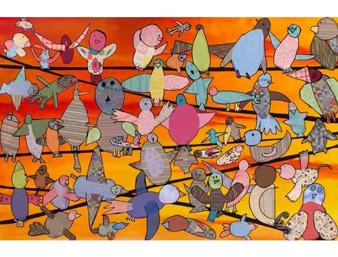 You are bidding on a canvas "birds on a wire" collage made by GRACE second grade students under the supervision of art teacher Merrily Boyd. The finished project measures 24"x36" (horizontal).