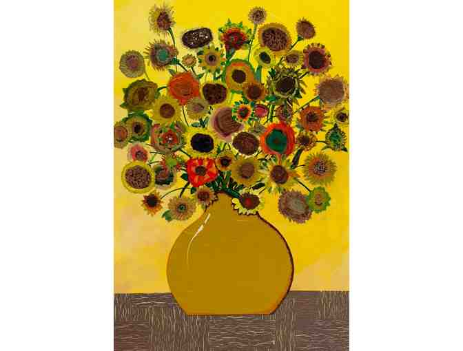 Third grade students learned about Vincent van Gogh and his swirly, textured paintings of sunflowers and other scenes. Each student painted one sunflower, using fabric paint to create texture. The flowers were then arranged in a mixed media scene of a vase full of blooming sunflowers.
