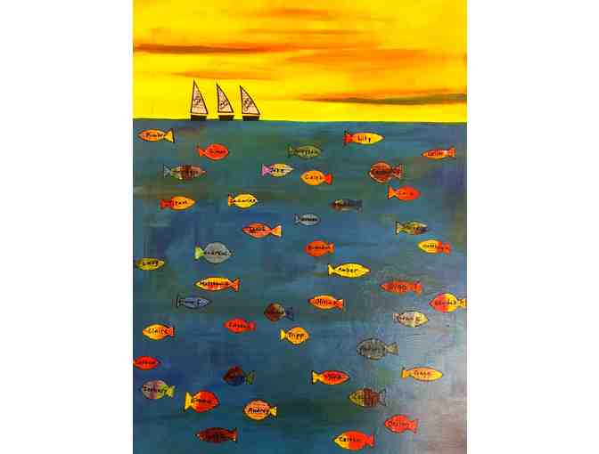 This piece combines paint and collage to make a fun image of a school of little fish! Kindergarten students painted their own fish shapes on newspaper, and the fish were then cut out and collaged to a brightly painted canvas. Three sailboats show the names of the kindergarten teachers. This would be a great painting for a kid's room, playroom, or even a beach house!