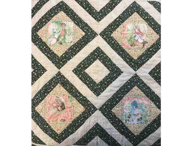 Includes a hand quilted 34" x 34" baby quilt featuring Beatrice Potter characters in gender neutral colors; along with a stuffed Peter Rabbit and a copy of the beloved children's classic. Perfect for a baby boy or girl.
