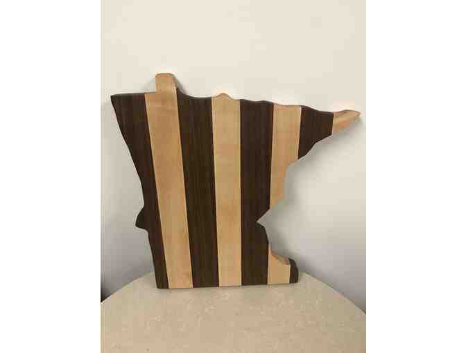 Handmade by a South Central College Carpentry student, this Minnesota-shaped cutting board is made from walnut and maple and is sure to be a conversation starter! Measures 15" x 14" and is treated with a coat of food safe wood oil.