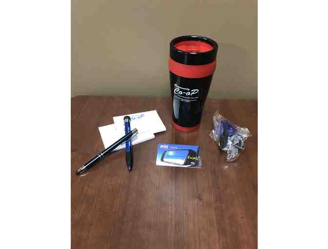 Community Co-op's Mobil station (formerly DeGrood West) on Highway 21 and 7th Street in Faribault is a convenient convenience store and gas station near South Central College. This gift card is worth $25.00 and comes with a travel mug and various goodies like a chip clip, post-it notes and pens.