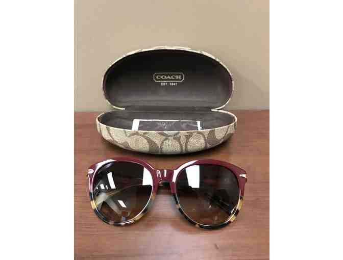 Tortoiseshell and burgundy sunglasses with gold accents by Coach. Brown gradient lenses. Comes with a hard Coach case and spray lens cleaner with cloth.