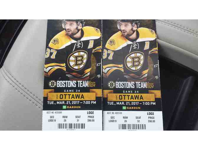 BOSTON BRUINS HOCKEY GAME: Two (2) Amazing Tickets versus the Ottawa Senators on Tuesday, March 21st, 2017 at 7:00pm. Seats are located in Loge 19, Row 26, Seats 31 & 32.
