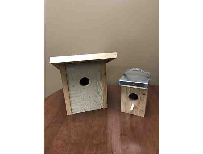 These two birdhouses weren't made for a specific kind of bird but they can be decorated as you wish and add charm to your garden space. The small one is special - it has South Central College stamped on the sheet metal handle.  Roof on large house measures 9.5" x 13". Small house is approximately 5" x 7".