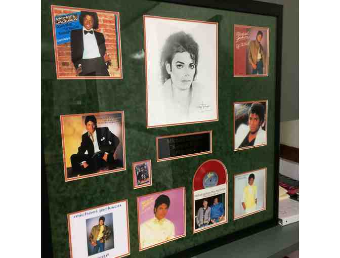 This compelling "King of Pop" collage features various hit singles and album covers recognized globally as the music of legendary Michael Jackson. This is a one-of-a-kind collectors' item and includes an autographed sketch of Michael Jackson that is signed by celebrity artist Gary Saderup and includes a trading card signed by Michael Jackson.