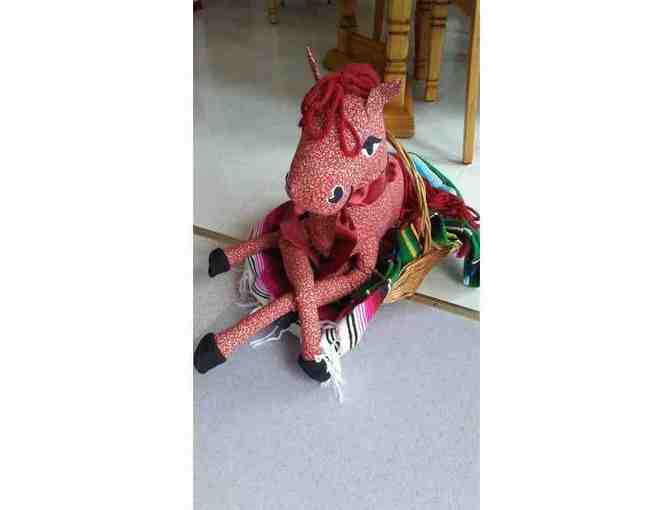 Fun, beautifully hand-sewn floppy horse that is based on a vintage stitchery pattern. The horse is paired with a cute cowboy blanket, or "serape." This horse would look great lounging on your bed or on your child's (grandchild's?) bed! The winner gets to name the horse after his/her favorite dancer, actor, singer, instrumentalist, or conductor! And singers, you might commiserate with this guy when you're both a "little horse."